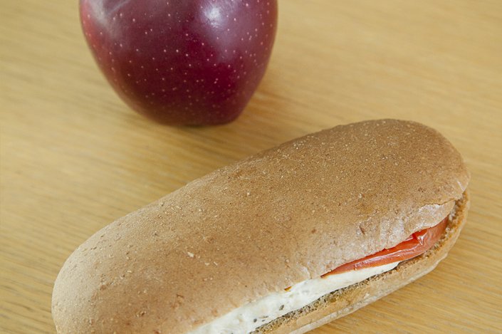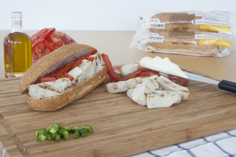 Σάντουιτς ολικής με κοτόπουλο και τομάτα.Παρασκευάζεται με ψωμί ολικής άλεσης, ψητό φιλέτο στήθος κοτόπουλο και τομάτα. Το φιλέτο κοτόπουλου αποτελεί ιδανική πηγή πρωτεΐνης υψηλής βιολογικής αξίας για σωστή ανάπτυξη, ενώ παράλληλα είναι χαμηλής περιεκτικότητας σε λιπαρά. Το ελαιόλαδο, που χρησιμοποιείται ως το μοναδικό πρόσθετο λίπος, προσφέρει πολύτιμα μονοακόρεστα λιπαρά και βιταμίνη Ε, που συμβάλλουν στην καλή υγεία της καρδιάς, ενώ η τομάτα είναι πλούσια σε λυκοπένιο, χρωστική που δίνει το κόκκινο χρώμα και παρέχει πρόληψη/προστασία έναντι πολλών νοσημάτων (ακόμα και διαφόρων μορφών καρκίνου).