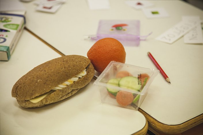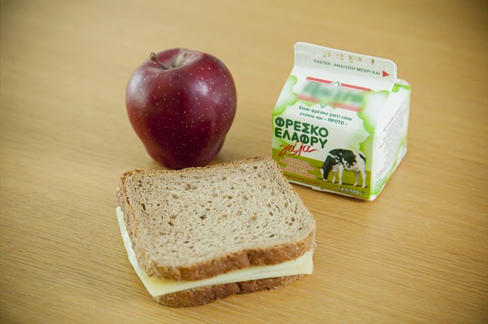 Σάντουιτς με αυγό, αγγουράκια και καροτάκια, πορτοκάλι. Το σάντουιτς παρασκευάζεται με αλεύρι ολικής άλεσης 60%, τυρί, αυγό και ελαιόλαδο. Το αυγό αποτελεί τροφή, πλούσια σε πρωτεΐνες υψηλής βιολογικής αξίας, βιταμίνες και ιχνοστοιχεία (συμβάλλουν στη σωστή ανάπτυξη, φυσική άμυνα, αλλά και ομαλή λειτουργία του οργανισμού). Ειδικότερα, περιέχει ασβέστιο, φώσφορο, νάτριο, κάλιο, βιταμίνη Α, Β12, φολικό οξύ, D, Ε και σημαντικές ποσότητες σιδήρου.