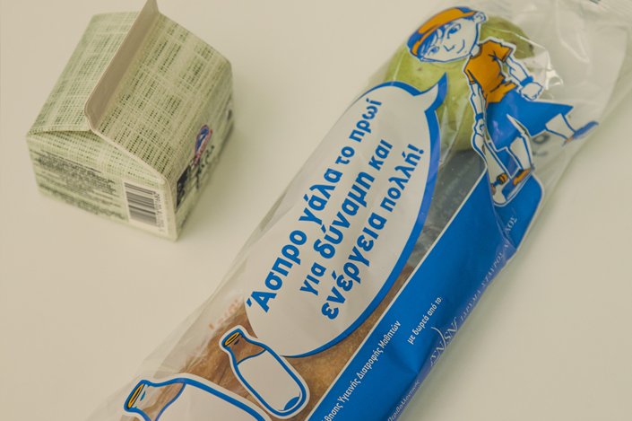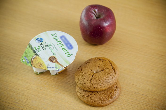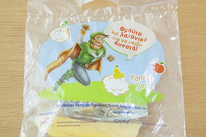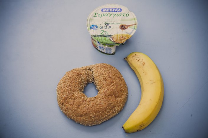 Κουλούρι Θεσσαλονίκης, γιαούρτι με μέλι και μπανάνα. Όλα μας τα προϊόντα είναι ελληνικά με μόνη εξαίρεση τη μπανάνα η οποία είναι αγαπημένο φρούτο των παιδιών, αλλά και δίνει πολύ ενέργεια, με υψηλή περιεκτικότητα σε θρεπτικά συστατικά, σε φυτικές ίνες, βιταμίνες και ιχνοστοιχεία. Δυστυχώς είναι αδύνατο να βρεθεί στην Ελλάδα στις αναγκαίες για το πρόγραμμα ποσότητες όλες τις εποχές. Επίσης όλα τα γαλακτοκομικά που χρησιμοποιούμε, συμπεριλαμβανομένου και του γιαουρτιού με το μέλι, έχουν επιλεγεί βάσει αυστηρών προδιαγραφών σε σχέση με την ποιότητα αλλά και τη θρεπτική τους αξία για τα παιδιά, προσέχοντας ταυτόχρονα την περιεκτικότητά τους σε λιπαρά και πάντα σύμφωνα με τις κατευθυντήριες οδηγίες του Παγκόσμιου Οργανισμού Υγείας για τα ζητήματα διατροφής.